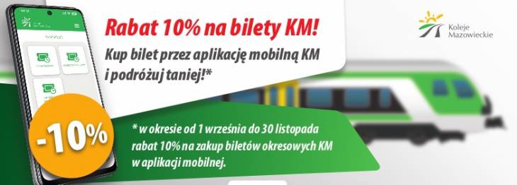 Informujemy, że od 1 września 2023 r. kupując bilet okresowy w aplikacji mobilnej Kolei Mazowieckich podróżni mogą liczyć na 10% rabat. Promocja obowiązuje do końca listopada i nie dotyczy biletów wg ofert specjalnych. Aplikacja mobilna KM to nieograniczony dostęp do kasy biletowej i punktu informacji będący w zasięgu ręki o każdej porze.