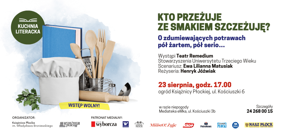 Na 23 sierpnia o godz. 17.00 zaplanowano Kuchnię Literacką, a w niej „Kto przeżuje ze smakiem szczeżuję? Będzie „O zdumiewających potrawach pół żartem, pół serio…” według scenariusza Ewy Lilianny Matusiak a temat „przeżuje” Teatr Remedium SUTW w Płocku, artystycznie i kulinarnie uodporniony przez Henryka Jóźwiaka, aktora Teatru Dramatycznego w Płocku. Adekwatne menu gwarantowane! Będą m.in. marynowane warzywa, a na popitkę sok ze skisłych buraków i rozwodniona grusconka do wyboru.