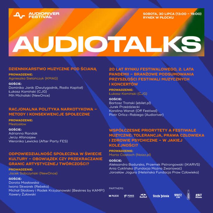 W dziennej strefie Audioriver, zgodnie z tradycją, będzie można kontynuować taniec przy dźwiękach elektroniki albo słuchać paneli dyskusyjnych z udziałem artystów, dziennikarzy oraz postaci ze świata kultury i edukacji. W festiwalowych rozmowach głos zabiorą m.in. Dorota Masłowska, Xawery Żuławski, Beskres by KAMP! oraz szef festiwalu Piotr Orlicz-Rabiega. Zapraszamy w sobotę od 13:00 do 19:00 na Stary Rynek.