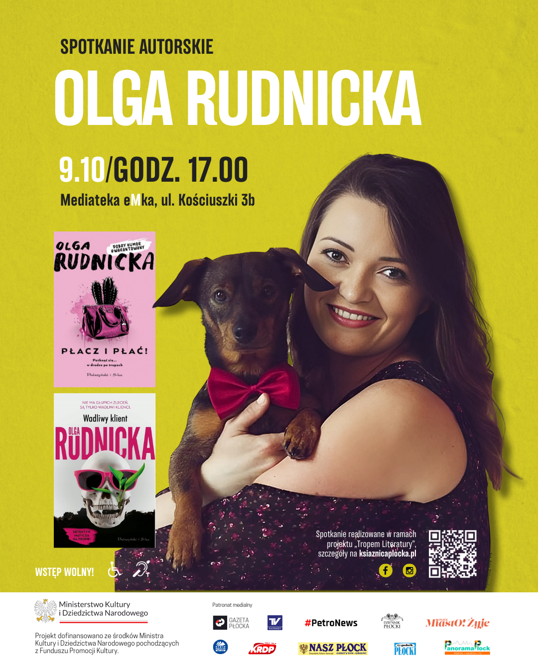 W czwartek 9 października o 17.00 w Mediatece eMce gościnią będzie Olga Rudnicka, autorka komediowych powieści kryminalnych i obyczajowych. To wydarzenie w projekcie „Tropem LITERATURY” dofinansowane ze środków Ministra Kultury i Dziedzictwa Narodowego pochodzących z Funduszu Promocji Kultury.