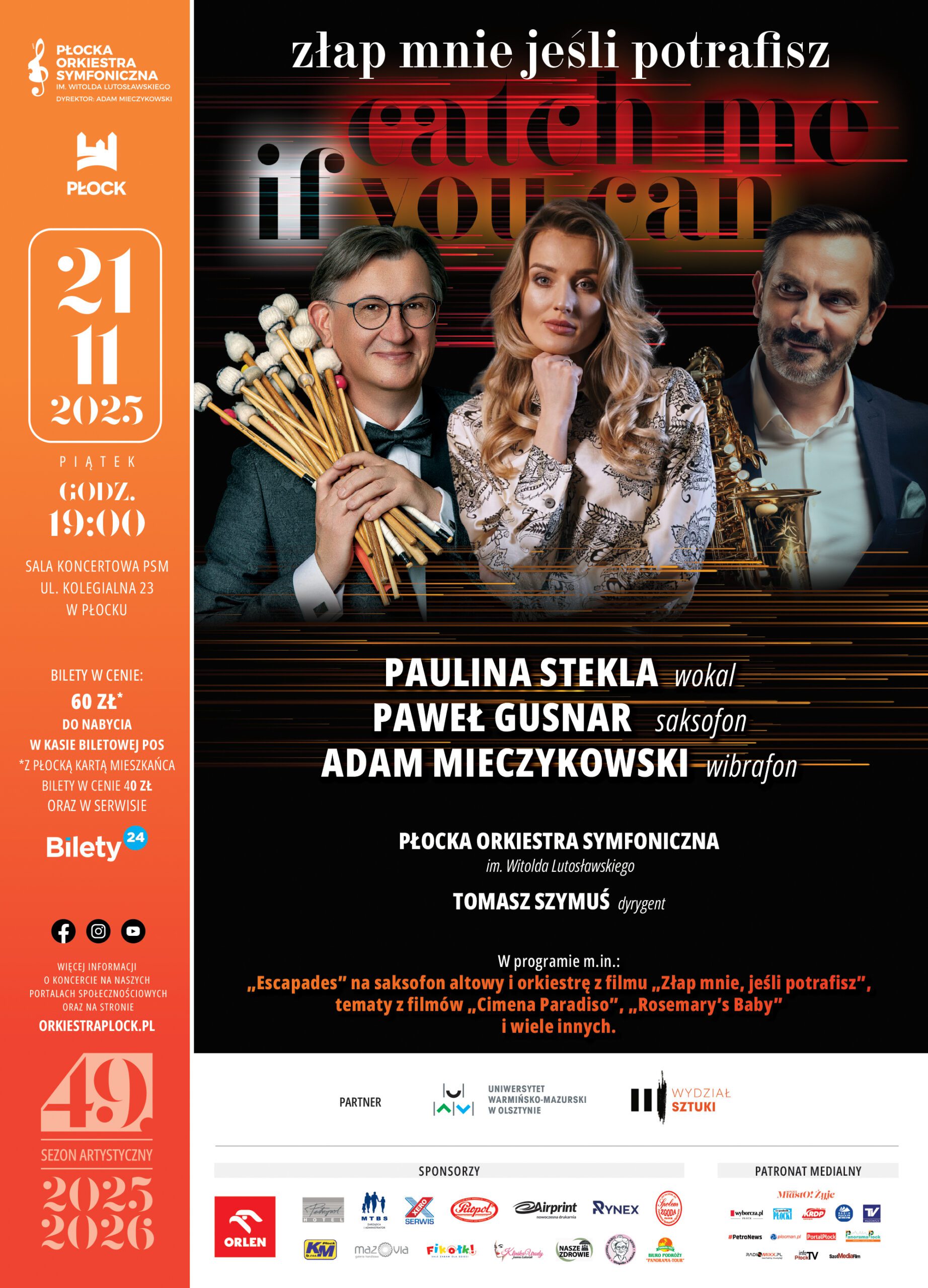 W listopadowy wieczór Płocka Orkiestra Symfoniczna zaprasza na wydarzenie podczas którego publiczność usłyszy muzykę, która od lat porusza widzów na całym świecie. Koncert „Catch Me If You Can – Złap mnie, jeśli potrafisz” przeniesie słuchaczy do świata kina poprzez wyjątkowe interpretacje i brzmienia. W programie m.in. słynne „Escapades” Johna Williamsa z filmu „Catch Me If You Can”, energetyczny koncert saksofonowy Roberto Molinellego „Four Pictures from New York”, wprowadzający w rytm nowojorskiej metropolii. Nie zabraknie także tematów z filmów: „Rosemary’s Baby”, „Top Gun: Maverick”, „Shrek” oraz wiele innych znakomitych kompozycji.