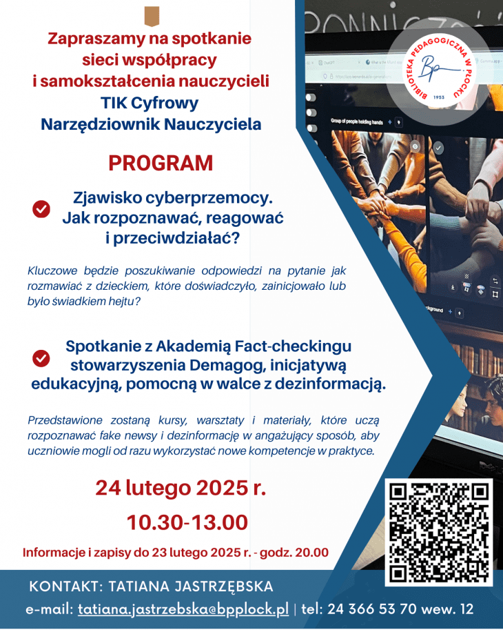 – Zjawiska cyberprzemocy i dezinformacji są wciąż aktualnym i narastającym problemem, które wymagają nieustannego doskonalenia wiedzy i umiejętności. W odpowiedzi na potrzeby nauczycieli organizujemy spotkanie, podczas którego uczestnicy zdobędą praktyczne narzędzia do przeciwdziałania tym zagrożeniom. Wydarzenie poprowadzą ekspertki Działu Profilaktyki Cyberzagrożeń w NASK-PIB oraz Akademii Fact-checkingu Stowarzyszenia Demagog, które podzielą się swoją wiedzą i doświadczeniem, dostarczając uczestnikom aktualnych i niezbędnych informacji. Naszym celem jest wyposażenie nauczycieli w skuteczne metody rozpoznawania, reagowania i zapobiegania cyberprzemocy oraz dezinformacji wśród dzieci i młodzieży – mówi Agnieszka Olczyk, dyrektorka Biblioteki Pedagogicznej w Płocku.