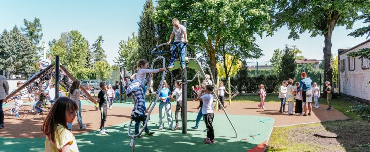 Dzieci na wyremontowanym placu zabaw w Szkole Podstawowej nr 5 w Płocku