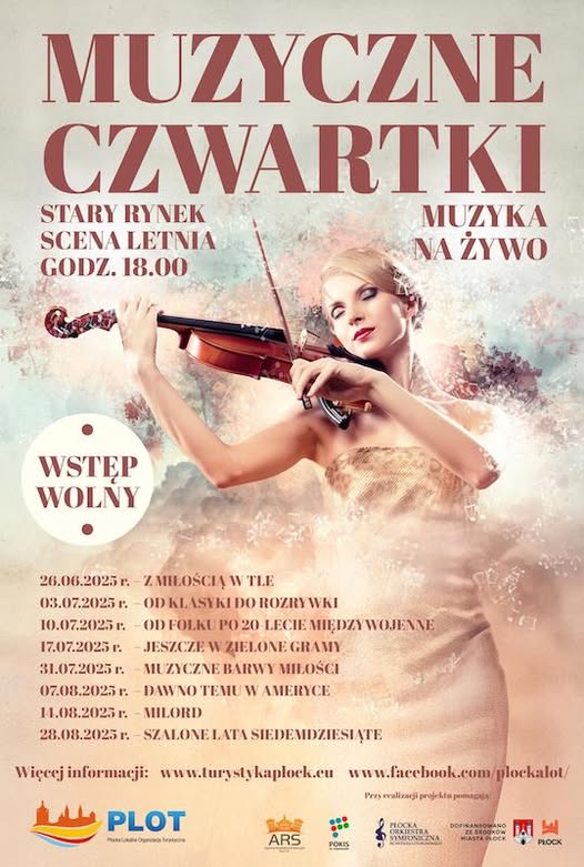 Płocka Lokalna Organizacja Turystyczna zaprasza do udziału w Muzycznych czwartkach na płockiej starówce. Na małej scenie odbędzie się osiem kameralnych koncertów w wykonaniu muzyków współpracujących z Płocką Orkiestrą Symfoniczną. Wstęp na koncerty jest wolny.