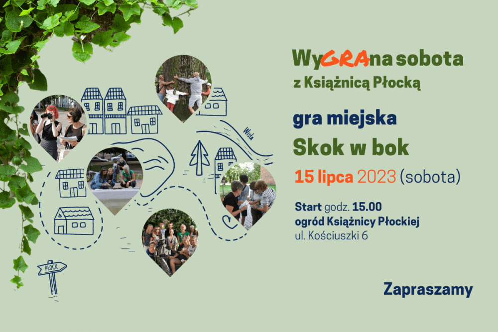 15 lipca, godz. 15.00 – III WyGRAna sobota z Książnicą Płocką „Skok w bok”. Tym razem w skonstruowaniu trasy i fabuły gry w poszczególnych punktach inspirowaliśmy się książką Piotra Gryszpanowicza „Leksykon nazw płockich ulic”. Zadania natomiast – jak zwykle niezwykłe, zaskakujące, w wersji dla dorosłych i dla dzieci. Tytuł gry – „Skok w bok” – niech będzie inspiracją, by czasem zboczyć z głównych ulic i pójść boczną dróżką, albo po prostu – zobaczyć jak najwięcej, przy okazji odkrywając może nieco mniej znaną historię ulic znanych i omijanych.