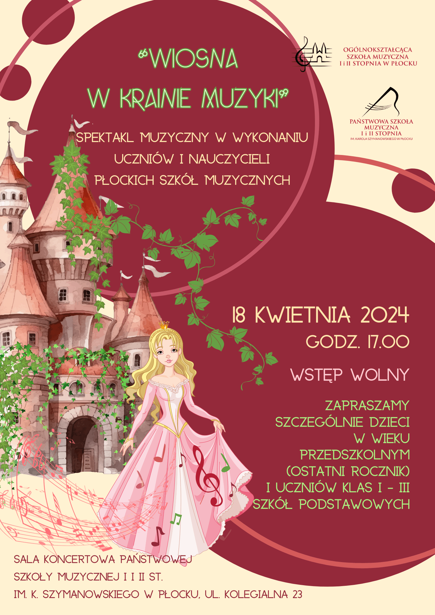 Państwowa Szkoła Muzyczna I i II st. im. Karola Szymanowskiego w Płocku serdecznie zaprasza na spektakl muzyczny dla dzieci pt. „Wiosna w krainie muzyki” w wykonaniu uczniów i nauczycieli płockich szkół muzycznych. Wydarzenie odbędzie się 18 kwietnia w czwartek o godzinie 17.00