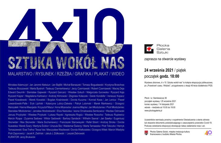 Przed nami kolejna ekspozycja jubileuszowa, komentująca 40-lecie działalności Płockiej Galerii Sztuki. Wystawę zbiorową „4 x 10. Sztuka wokół nas” tworzy blisko 170 prac 83 polskich twórców reprezentujących niemal wszystkie dziedziny sztuki: malarstwo, rysunek, rzeźbę, plakat i inne. Jej otwarcie zaplanowano na 24 września o 18:00.