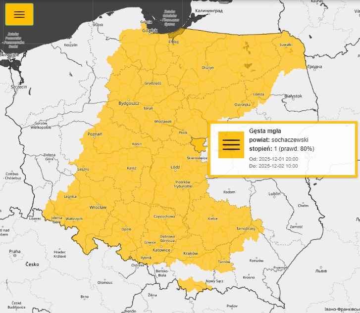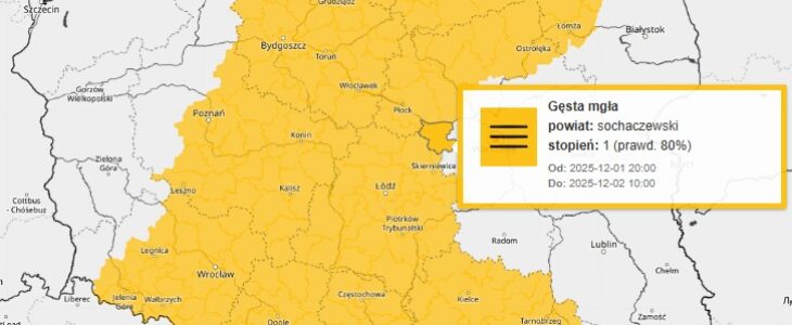 Instytut Meteorologii i Gospodarki Wodnej prognozuje gęste mgły, w zasięgu których widzialność może miejscami wynosić poniżej 200 m. Mgły lokalnie będą osadzać szadź, powodując śliskość nawierzchni dróg i chodników. Zjawisko może się pojawić od godziny od godz. 20:00 dnia 1.12.2025 do godz. 10:00 dnia 2.12.2025 na terenie powiatu płockiego i Płocka.