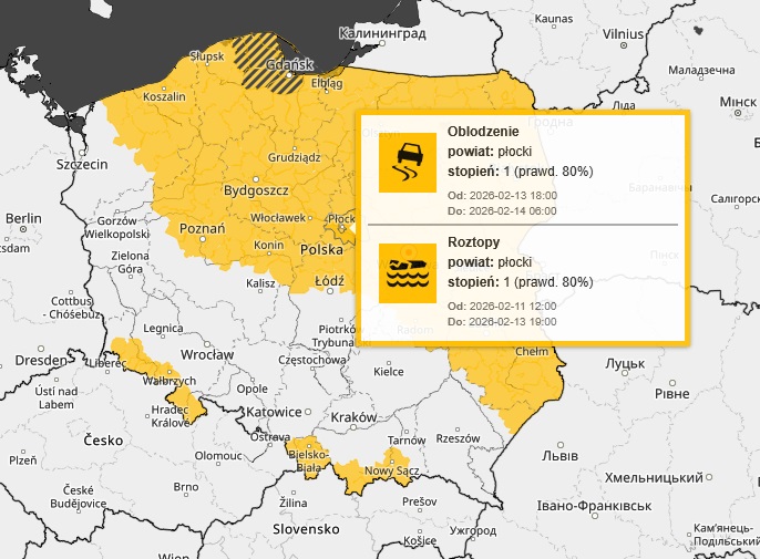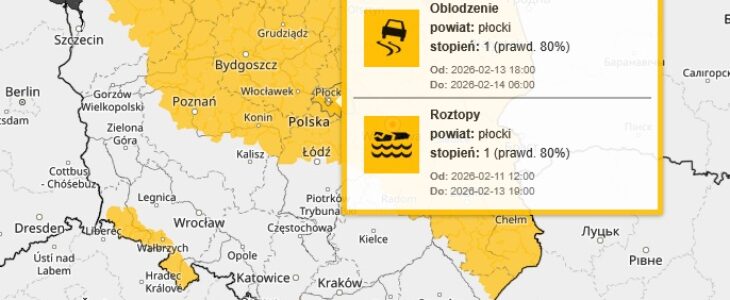 IMGW-PIB Centralne Biuro Prognoz Meteorologicznych – Wydział w Warszawie informuje o opadach marznącego deszczu lub mżawki powodujące gołoledź. Ostrzeżenie pierwszego stopnia obowiązuje od godz. 18 dnia 13.02.2026 do godz. 6:00 dnia 14.02.2026 na terenie województwa mazowieckiego i powiatu płockiego.