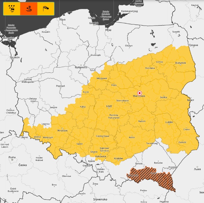 Prognozowane są słabe, okresami umiarkowane, opady marznącego deszczu lub mżawki, powodujące gołoledź. Prawdopodobieństwo wystąpienia zjawiska 70%.