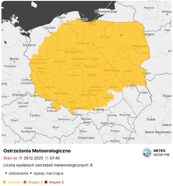 IMGW-PIB Centralne Biuro Prognoz Meteorologicznych – Wydział w Warszawie prognozuje zamarzanie mokrej nawierzchni dróg i chodników po opadach deszczu ze śniegiem i mokrego śniegu, powodujące ich oblodzenie na terenie Płocka i powiatu płockiego. Ostrzeżenie obowiązuje od godz. 17:00 do godz. 24:00 dnia 29.12.2025 r.