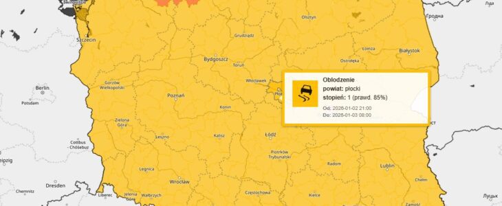 IMGW-PIB Centralne Biuro Prognoz Meteorologicznych – Wydział w Warszawie prognozuje zamarzanie mokrej nawierzchni dróg i chodników po opadach deszczu ze śniegiem i mokrego śniegu, powodujące ich oblodzenie na terenie Płocka i powiatu płockiego. Ostrzeżenie obowiązuje od godz. 21:00 w piątek 2 stycznia do godz. 8:00 w sobotę 3 stycznia 2026 r.
