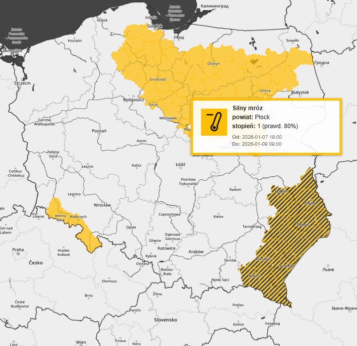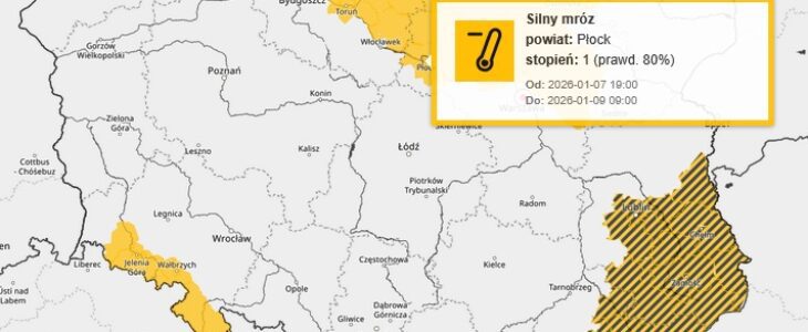IMGW-PIB Centralne Biuro Prognoz Meteorologicznych wydało ostrzeżenie przed silnym mrozem na terenie Płocka i powiatu płockiego. Ostrzeżenie obowiązuje do 10 stycznia i może zostać przedłużone.