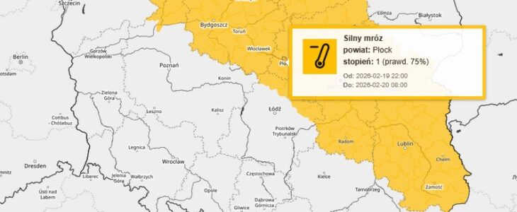 Prognozuje się lokalnie spadek temperatury w nocy do -15°C. Wiatr o średniej prędkości od 5 km/h do 10 km/h. Ostrzeżenie obowiązuje od godz. 22 dnia 19.02.2026 r. do godz. 8:00 dnia 20.02.2026 r. dla miasta Płocka i powiatu płockiego.