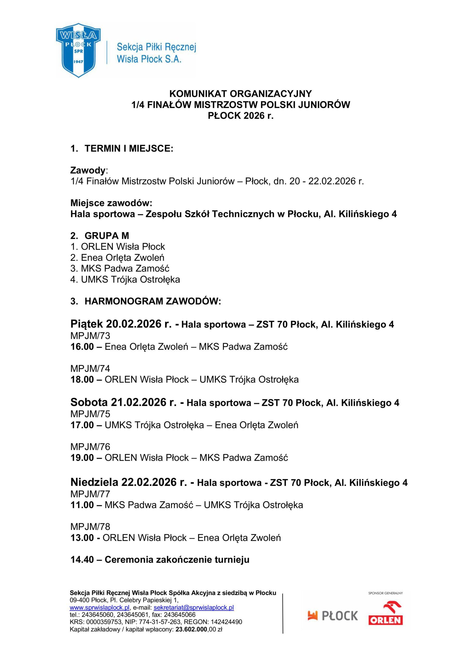 W dniach 20–22 lutego 2026 roku Płock stanie się areną zmagań najlepszych juniorskich zespołów piłki ręcznej w kraju. W hali sportowej Zespołu Szkół Technicznych przy Al. Kilińskiego 4 rozegrany zostanie turniej 1/4 Finałów Mistrzostw Polski Juniorów.