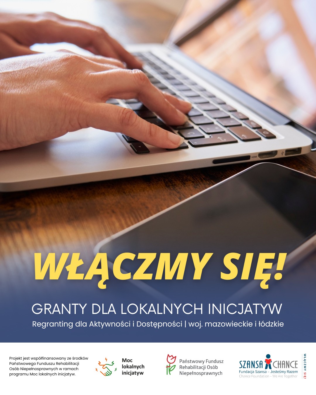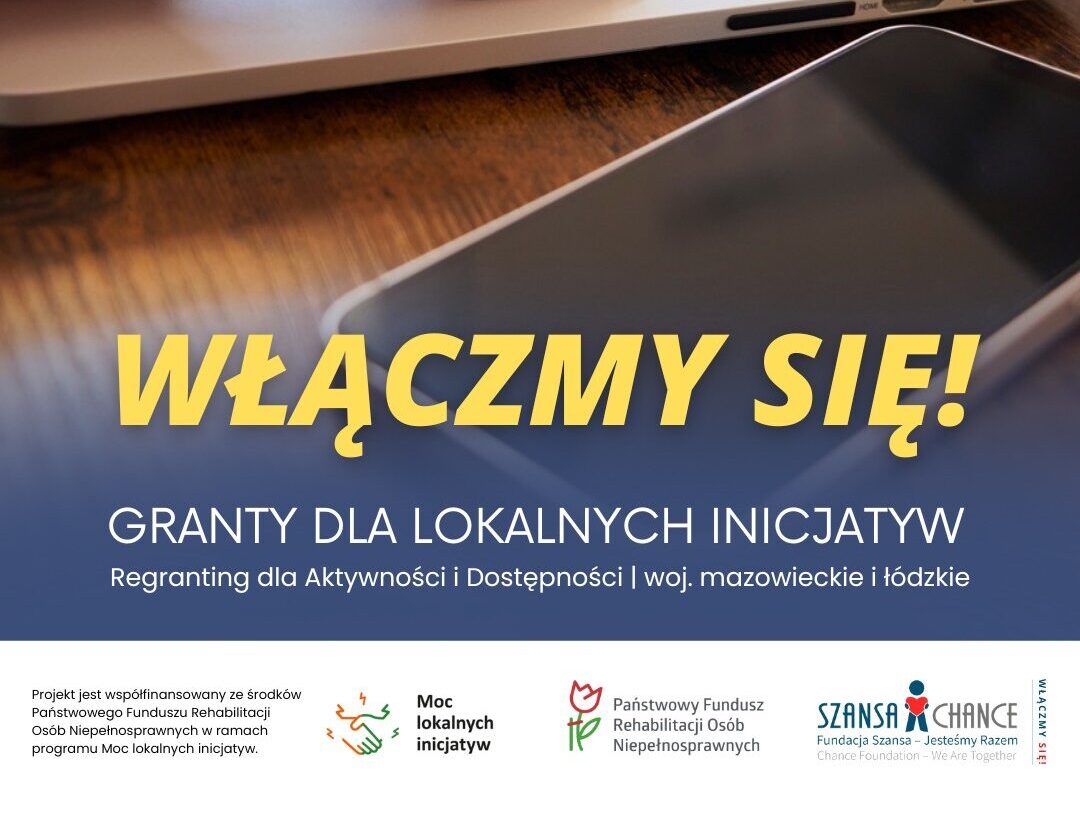 Fundacja Szansa – Jesteśmy Razem ogłosiła nabór wniosków w projekcie „Włączmy się!”. O granty w ramach tego przedsięwzięcia mogą ubiegać się organizacje pozarządowe działające na rzecz osób z niepełnosprawnościami w województwach mazowieckim i łódzkim. Wnioski można składać do 19 lutego 2026 r. za pomocą formularza elektronicznego znajdującego się na stronie https://www.szansadlaniewidomych.org/pl/ w zakładce „Włączmy się!”. Projekt realizowany jest w ramach programu „Moc lokalnych inicjatyw” i współfinansowany przez Państwowy Fundusz Rehabilitacji Osób Niepełnosprawnych.