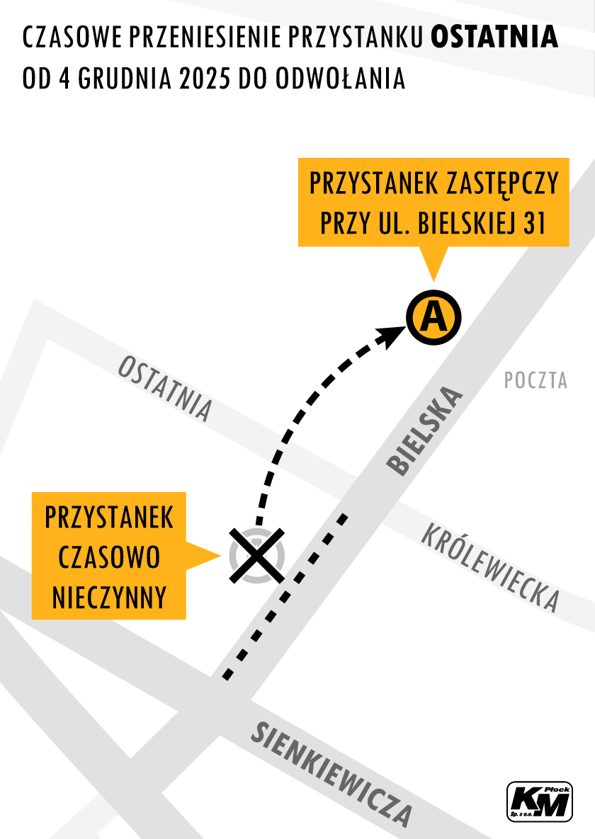 Na czas zamknięcia zachodniego pasa ul. Bielskiej zostaną wyznaczone objazdy dla pojazdów, także dla autobusów Komunikacji Miejskiej, ul. Ostatnią. Zamknięty będzie także przystanek autobusowy przy ul. Bielskiej. Zostanie wyznaczony przystanek tymczasowy naprzeciwko budynku Poczty Polskiej.