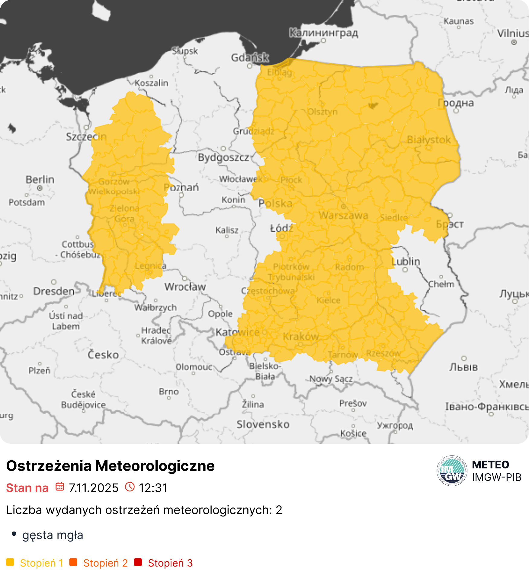 Instytut Meteorologii i Gospodarki Wodnej – PIB ostrzega przed możliwością wystąpienia gęstej mgły, w zasięgu której widzialność może miejscami wynosić poniżej 200 m. Ostrzeżenie obowiązuje na terenie województwa mazowieckiego i Płocka od godz. 21:00 dnia 07.11.2025 do godz. 10:00 w dniu 08.11.2025 r.