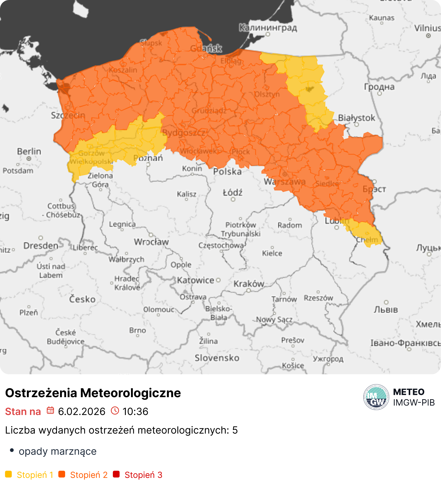 Prognozowane są słabe opady marznącego deszczu lub mżawki powodujące gołoledź. W dzień, z północy na południe, zacznie przemieszczać się strefa opadów śniegu. Zjawisko może wystąpić od godz. 18:00 dnia 06.02.2026 r. do godz. 12:00 dnia 07.02.2026 r.