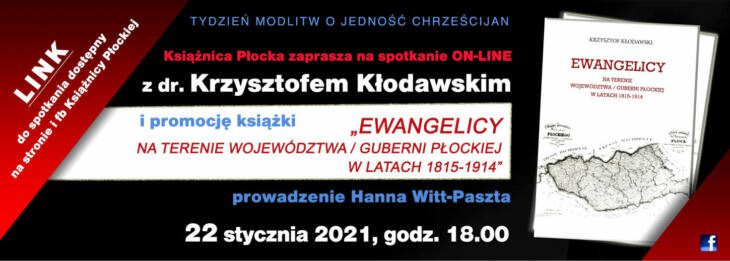 Bohaterem wydarzenia będzie dr Krzysztof Kłodawski, a tematem – publikacja „Ewangelicy na terenie województwa / guberni płockiej w latach 1815-1914”, która przypomina o obecności przedstawicieli różnych odłamów protestantyzmu w Płocku i okolicach na przestrzeni stu lat.