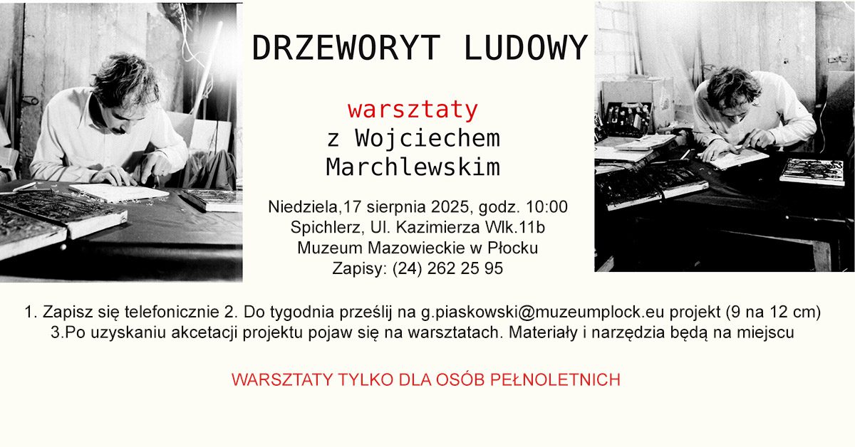 Warsztaty drzeworytu ludowego z Wojciechem Marchlewskim, autorem wystawy „Podróż na Wschód. Od drzeworytu ludowego do japońskiej mokuhangi”. Uczestnicy, w ciągu czterech godzin wykonają drewniane matryce na podstawie przesłanych uprzednio projektów o wymiarach 9 na 12 cm. Następnie wykonają odbitki. Tematyka prac może być tradycyjna lub nowoczesna – nie mamy tu ograniczeń, jednak projekty muszą być zaakceptowane przez prowadzącego z uwagi na wymagania techniczne. Narzędzia i materiały będą zapewnione.