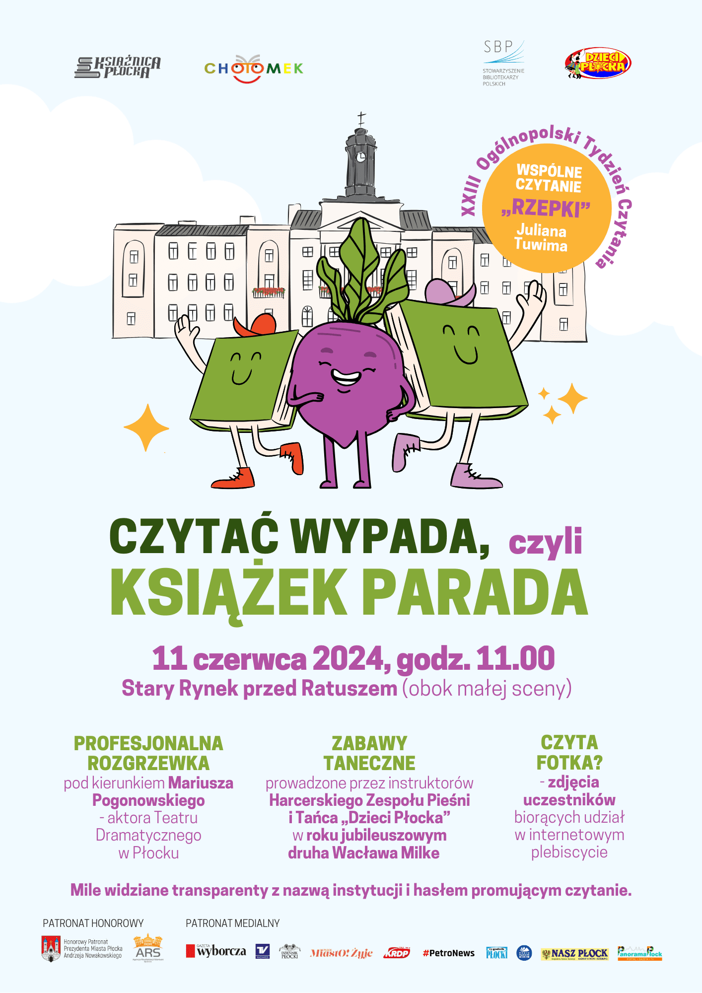 We wtorek 11 czerwca o godz. 11.00 zapraszamy na coroczne wydarzenie – Czytać wypada, czyli książek parada – wspólne czytanie „Rzepki” Juliana Tuwima z udziałem Prezydenta Miasta Płocka i zaproszonych gości w ramach XXIII Ogólnopolskiego Tygodnia Czytania Dzieciom.