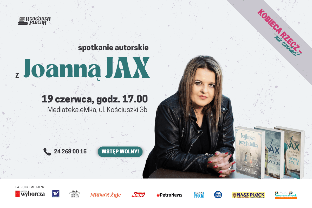 Natomiast 19 czerwca zapraszamy do Mediateki na spotkanie autorskie z Joanną Jax, autorką powieści bardzo cenionych przez czytelniczki i czytelników, m.in. „Dziedzictwo von Becków”, serii „Zemsta i przebaczenie”, „Córka fałszerza”, „Na obcej ziemi” i innych. Jest finalistką Festiwalu Pióro i Pazur, Laureatką Wawrzynu – Literackiej Nagrody Warmii i Mazur za rok 2016 (nagroda czytelników), dwukrotnie nominowaną do Książki Roku portalu Lubimy Czytać w kategorii „książka historyczna”. Zajmuje się również copywritingiem i jest wolontariuszką w Fundacji dla Rodaka wspierającej Polaków w Kazachstanie.
