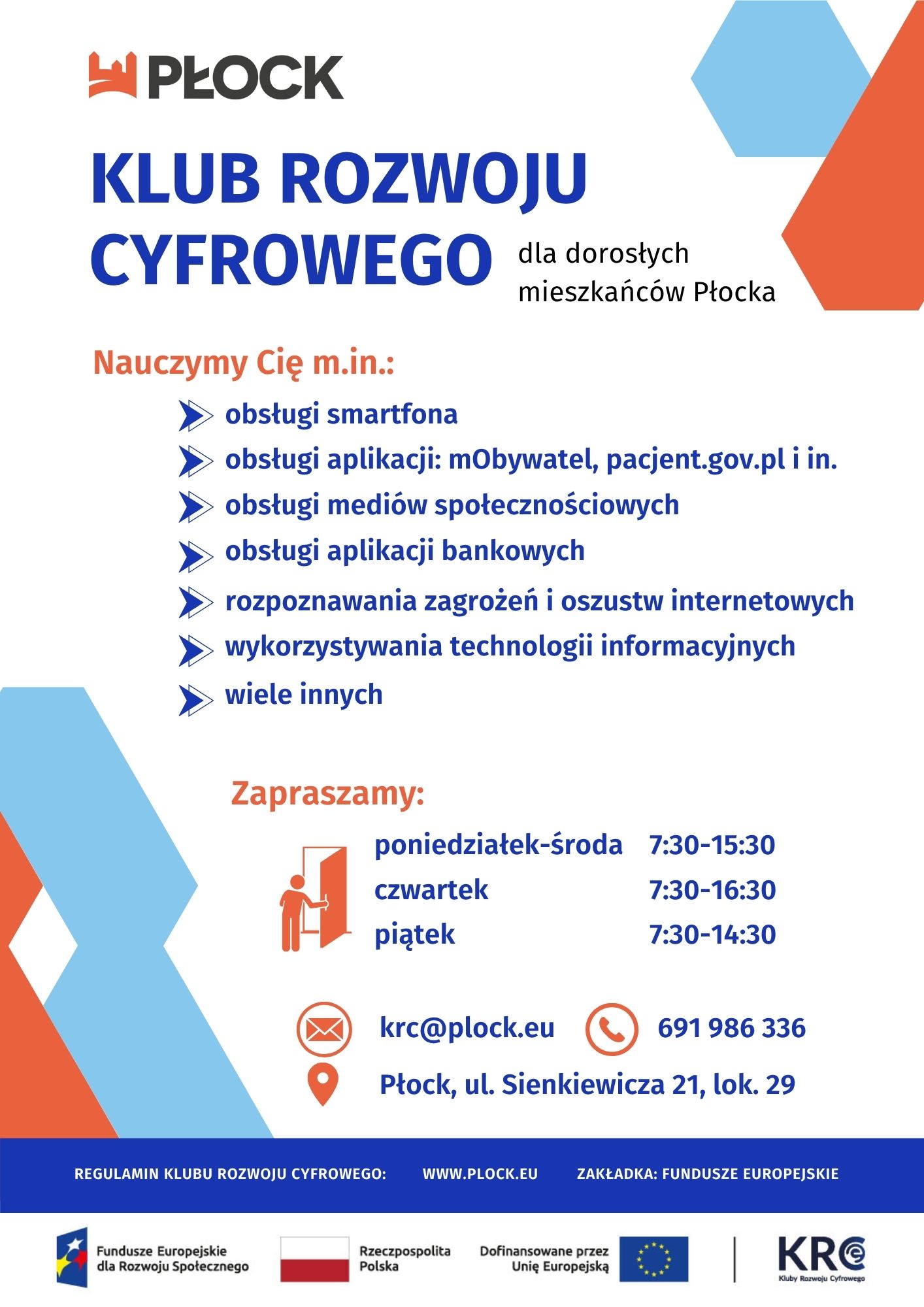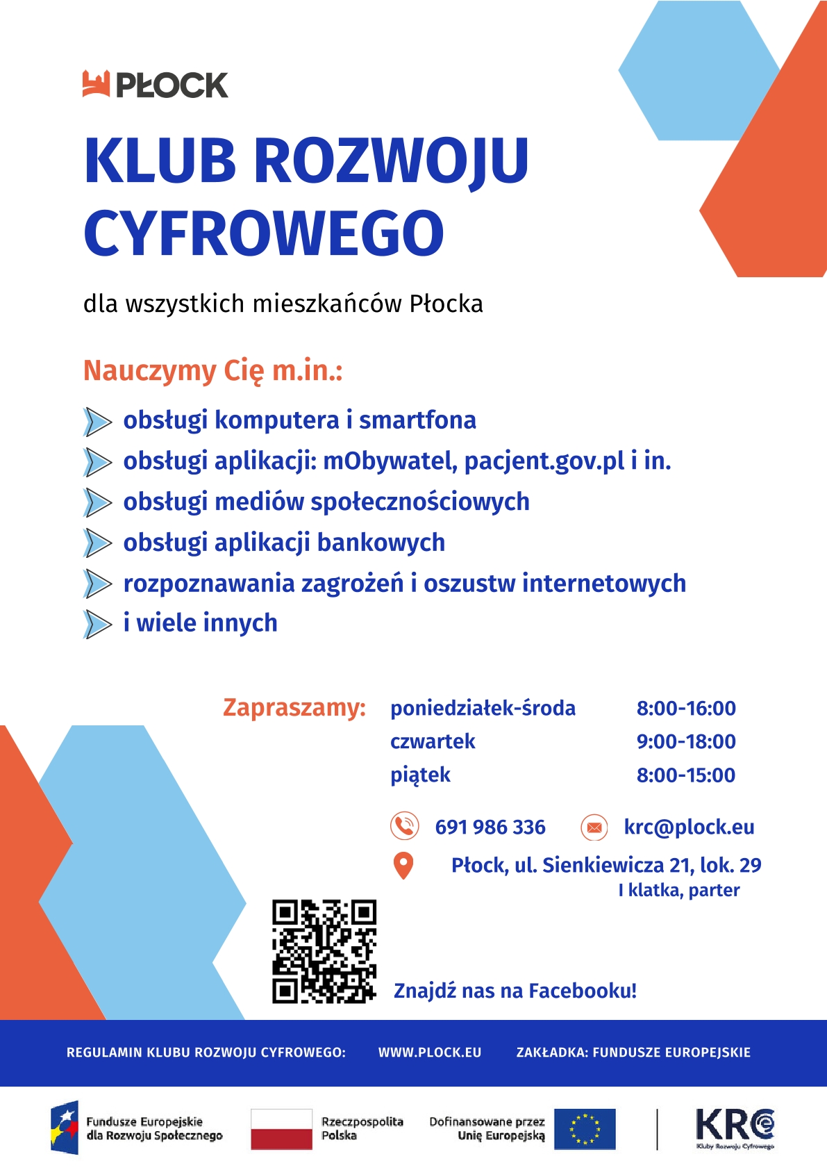 CEL GŁÓWNY PROJEKTU: Podniesienie poziomu kompetencji cyfrowych u 269 mieszkańców Płocka poprzez stworzenie na szczeblu lokalnym systemowego wsparcia osób dorosłych w nabywaniu i doskonaleniu umiejętności cyfrowych – utworzenie Klubu Rozwoju Cyfrowego (KRC) w Płocku w okresie od 01.03.2025 r. do 30.06.2027 r.