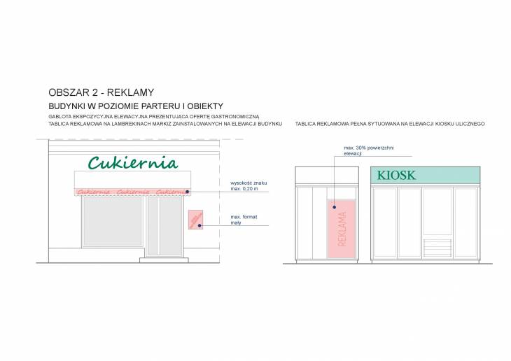 1) Na elewacji kiosku ulicznego w formie tablicy reklamowej pełnej, o maksymalnym polu powierzchni służącym ekspozycji reklamy równym 30% powierzchni elewacji, na której tablica jest umieszczona.
